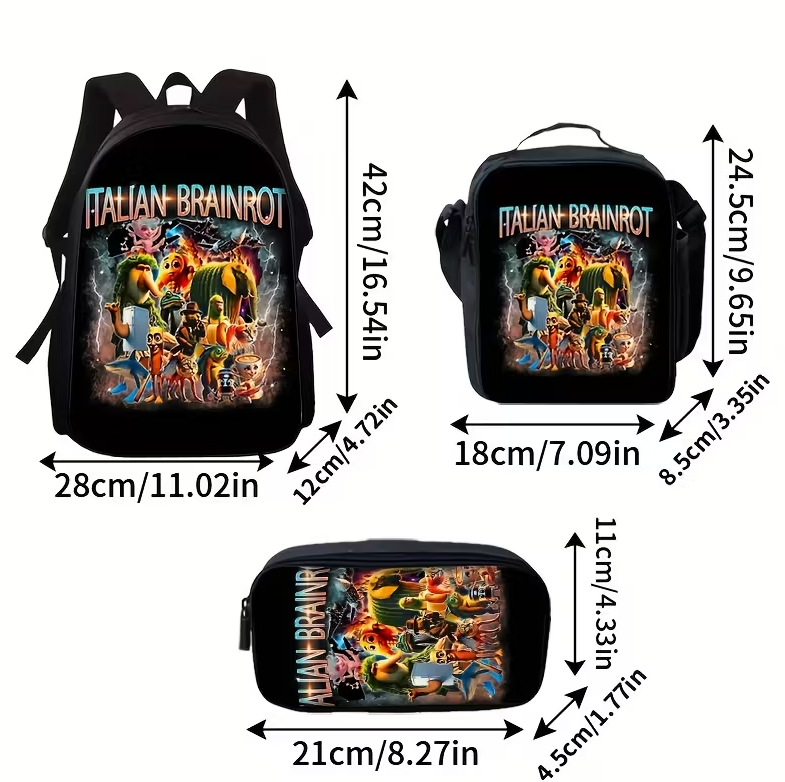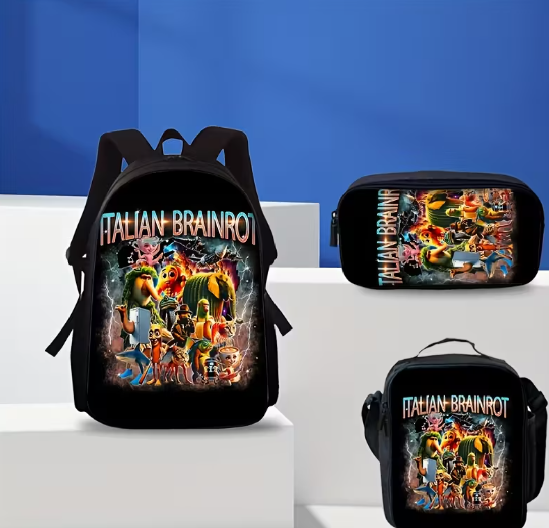 Maak een statement met deze opvallende rugzakset die de Italian Brainrot-trend perfect belichaamt. De set bestaat uit: