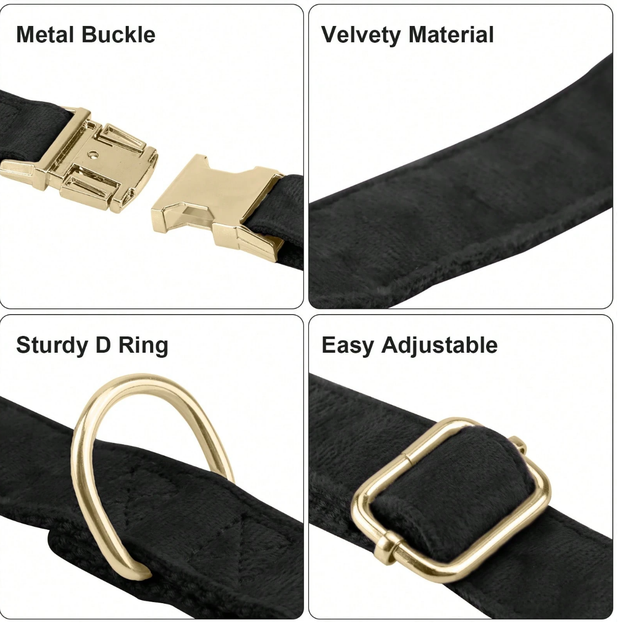 Geef je hond een elegante look met deze zachte fluwelen halsband in stijlvol grijs, afgewerkt met goudkleurige metalen hardware. De verstelbare band (maat XL: 37–60 cm) is geschikt voor middelgrote tot grote honden en voorzien van een snelontgrendelende gesp en stevige D-ring voor riem of penning. Het fluweel voelt comfortabel aan en is tegelijk duurzaam en machinewasbaar. Perfect voor dagelijks gebruik of als chique cadeau voor je huisdier. Combineer met bijpassende riem voor een complete look.