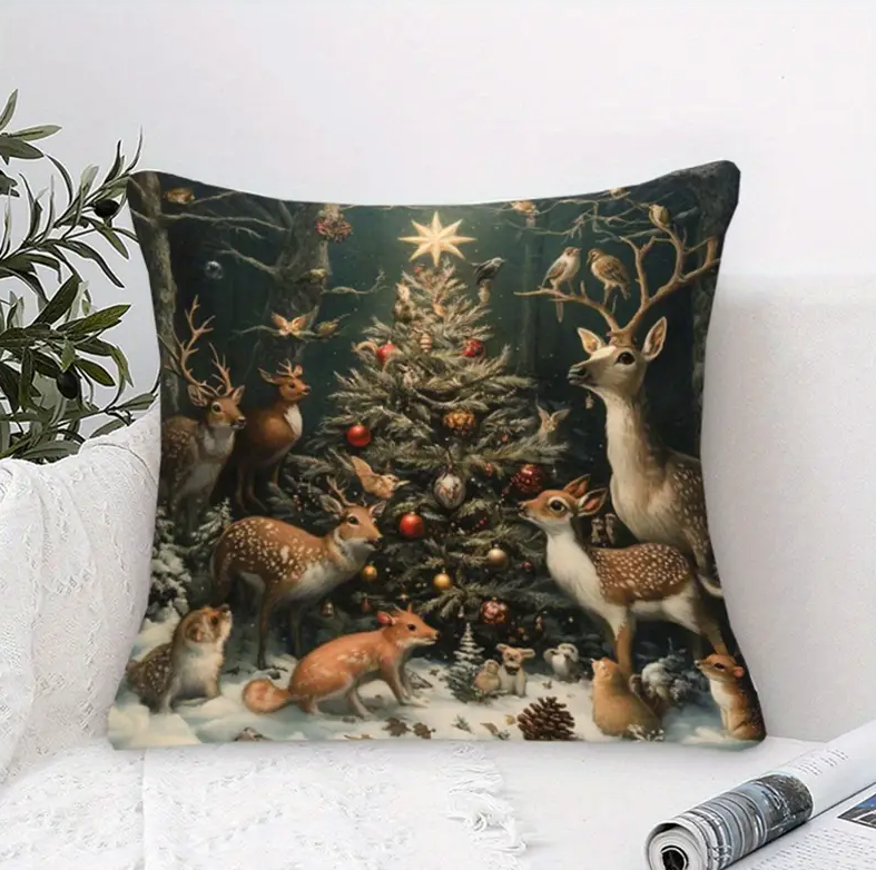 Breng een magische wintersfeer in huis met deze kerst kussenhoes featuring een sfeervolle bosdieren-scène rond een versierde kerstboom. De illustratie toont herten, vossen, konijnen, uilen en meer in een besneeuwd bos – perfect voor een rustieke en warme uitstraling. Gemaakt van kort pluche polyester, met een dubbelzijdige print en ritssluiting voor eenvoudig gebruik. De hoes is machinewasbaar en verkrijgbaar in meerdere formaten (40×40 cm, 45×45 cm, 50×50 cm). Ideaal als seizoensaccent op bank, fauteuil of bed. Binnenkussen niet inbegrepen.