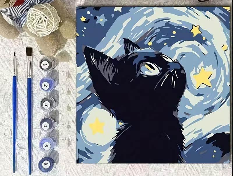 Bring peace and creativity together with this colorful DIY oil painting of a dreamy black cat under a starry sky. Perfect for cat lovers, hobbyists, and anyone looking for a moment of relaxation.