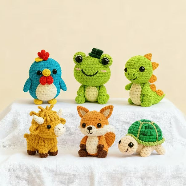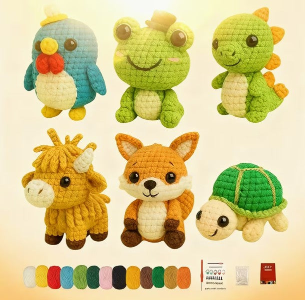 Dit pakket bevat alles wat je nodig hebt om zes schattige gehaakte dieren te maken: een pinguïn, kikker, dinosaurus, hooglander, vos en schildpad. Dankzij het fluffy chenillegaren, de duidelijke instructies en de beginnersvriendelijke materialen is dit de perfecte set voor zowel starters als ervaren hakers.