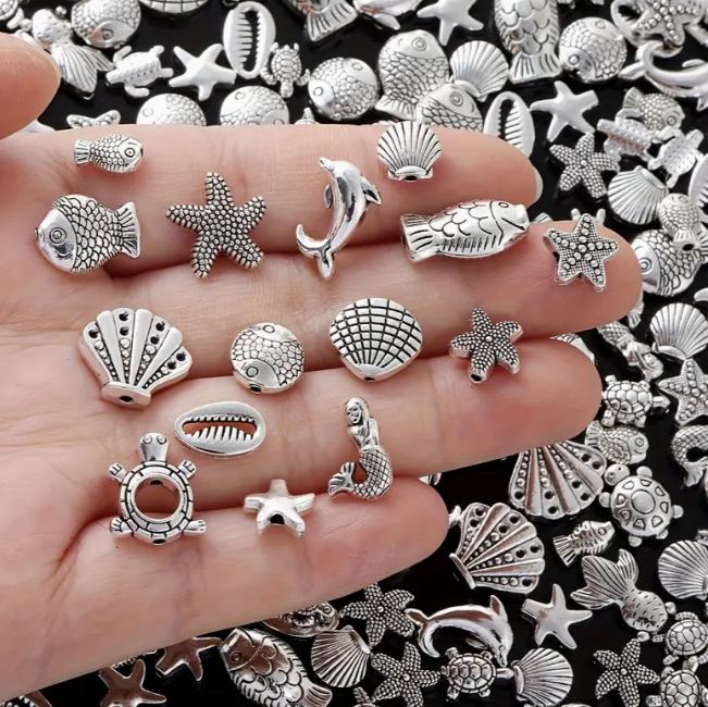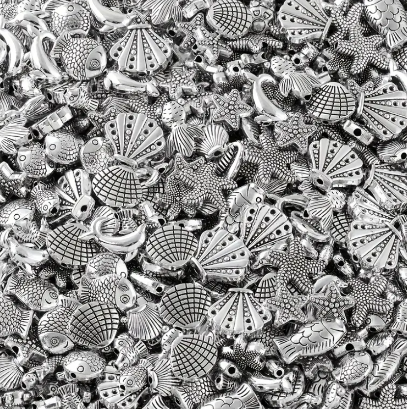 Breng een vleugje zee in je creaties met deze prachtige set van 100 zilverkleurige spacerkralen in oceaanstijl. De kralen zijn gedetailleerd vormgegeven als zeedieren en maritieme figuren zoals schildpadden, vissen, zeesterren, dolfijnen, schelpen en zelfs zeemeerminnen. Perfect voor het maken van unieke sieraden, sleutelhangers, oorbellen en decoratieve projecten.