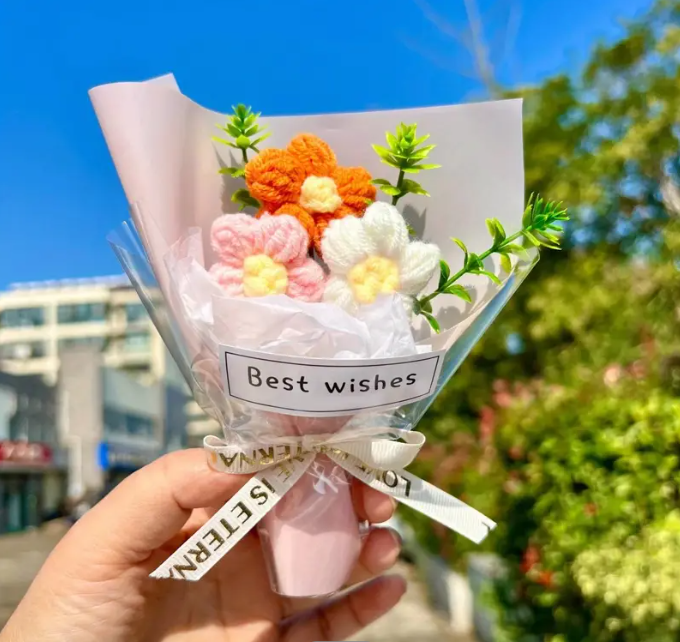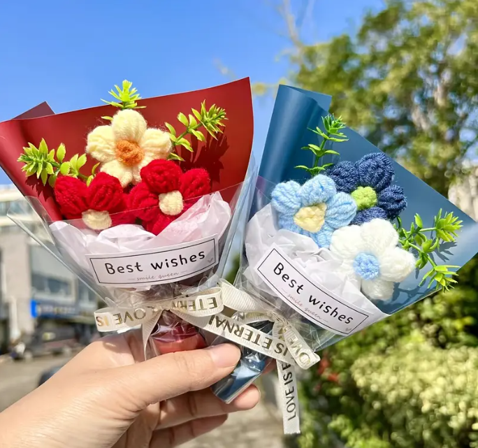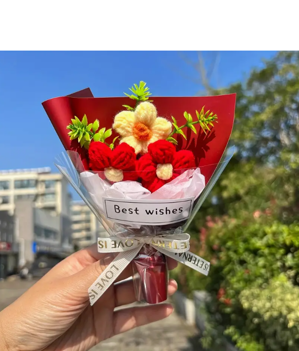 Bring warmth, ambiance, and personality to your home with this hand-knit daisy bouquet. These soft knitted daisies are carefully handcrafted from sustainable yarn, ensuring they retain their shape and color without maintenance. No watering, no wilting—just lasting charm.
