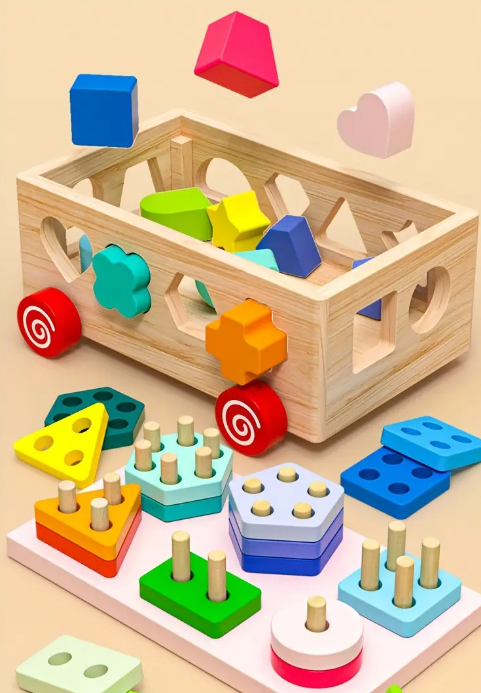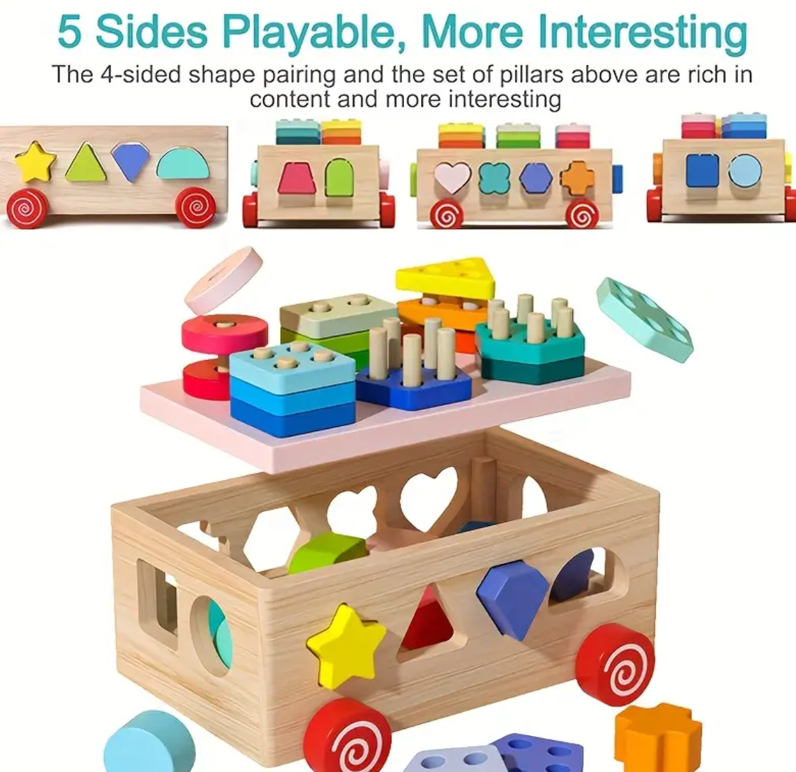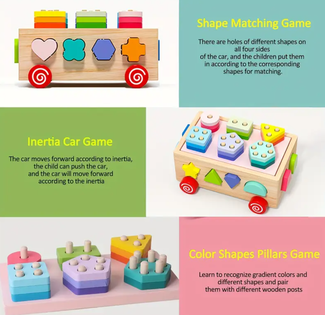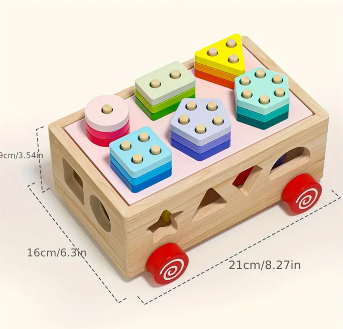 Stimulez le développement cognitif de votre enfant avec ce chariot d'intelligence coloré en bois. Ce jouet est doté d'un chariot robuste sur roulettes et de 12 découpes pour différentes formes géométriques, dont des cercles, des carrés, des triangles et des hexagones. Les formes sont empilées et fixées avec des chevilles en bois, pour un jeu plus stimulant et amusant. Idéal pour développer la reconnaissance des formes, des couleurs et la motricité fine.