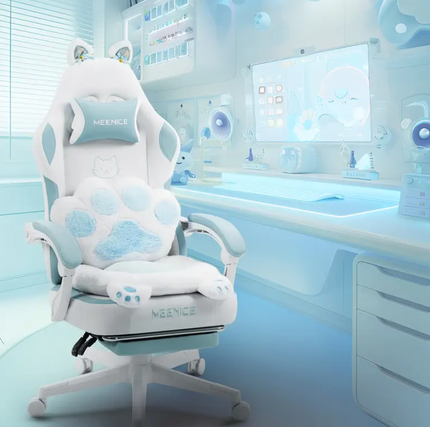 Gamingstoel Kattenoren –  Blauw & Wit – Ergonomisch met Verstelbare Voetsteun – Voor Anime Fans & Gamers – 136 kg Draagkracht